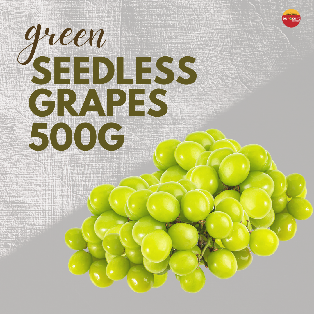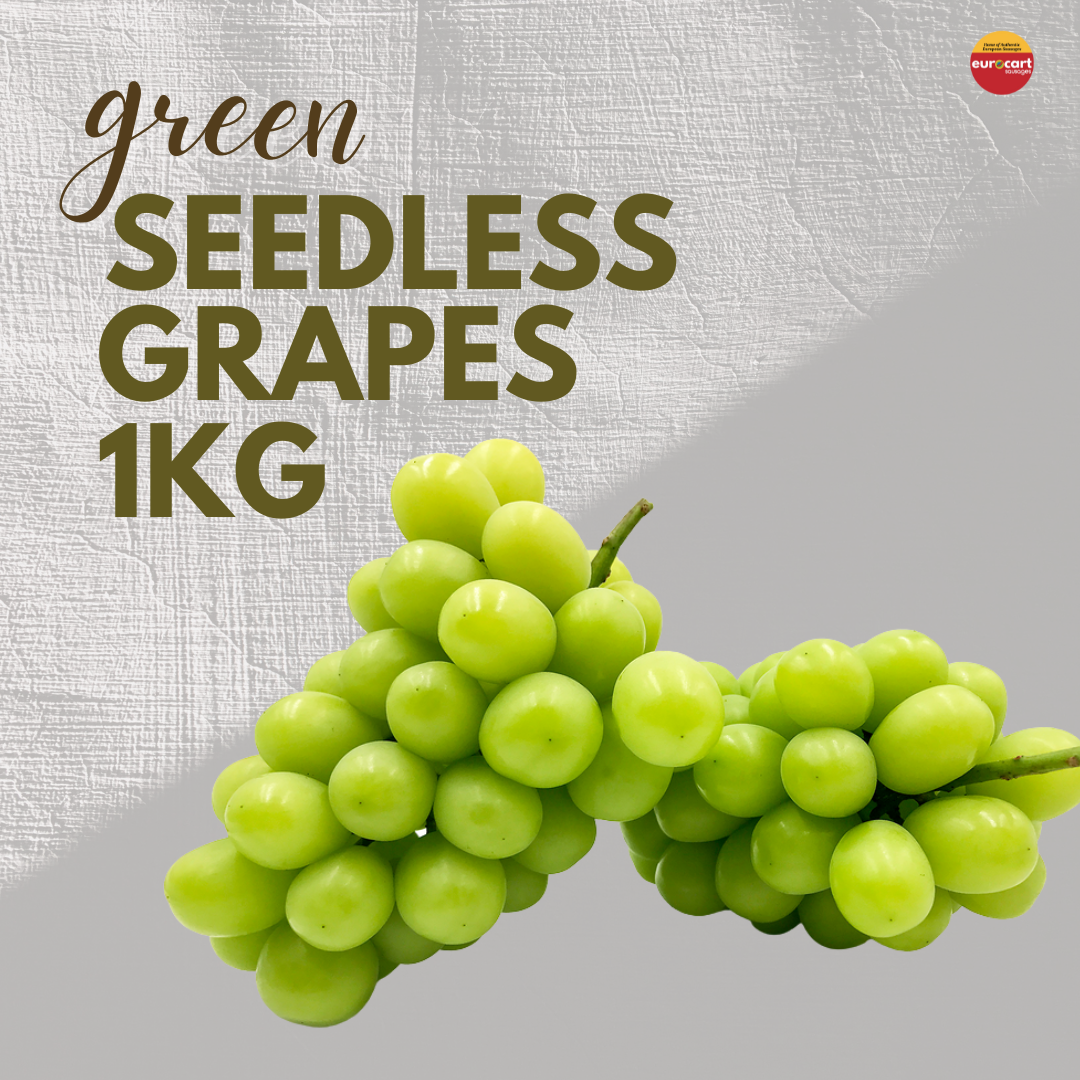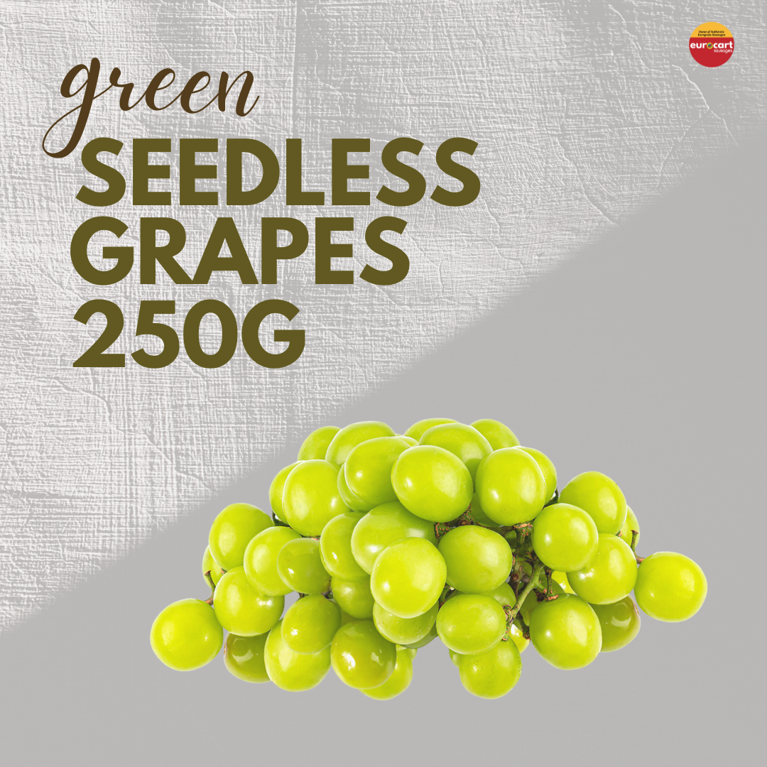 Green seedless grapes in 250g, 500g, and 1kg packs.