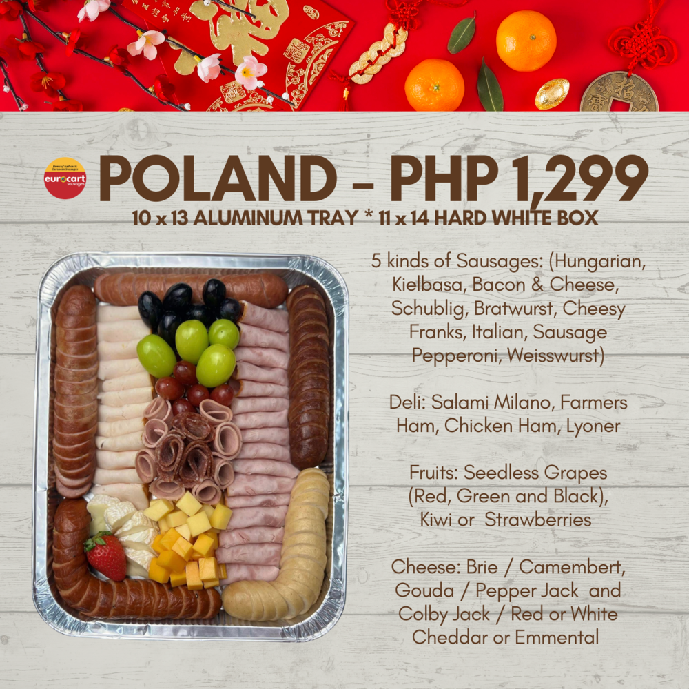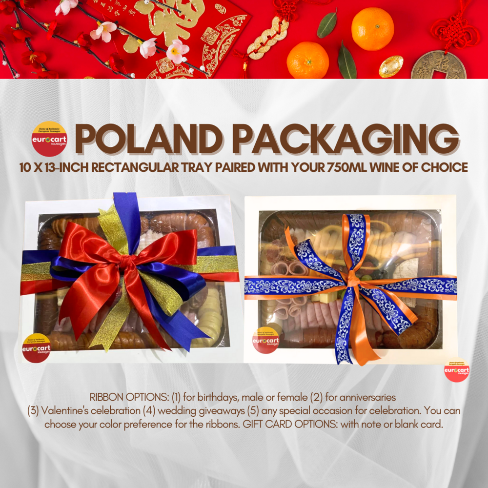The POLAND Meat Platter ready-to-eat meat platter is served in a 13 x 10-inch tray and securely packed in a white box with customizable colored ribbons.