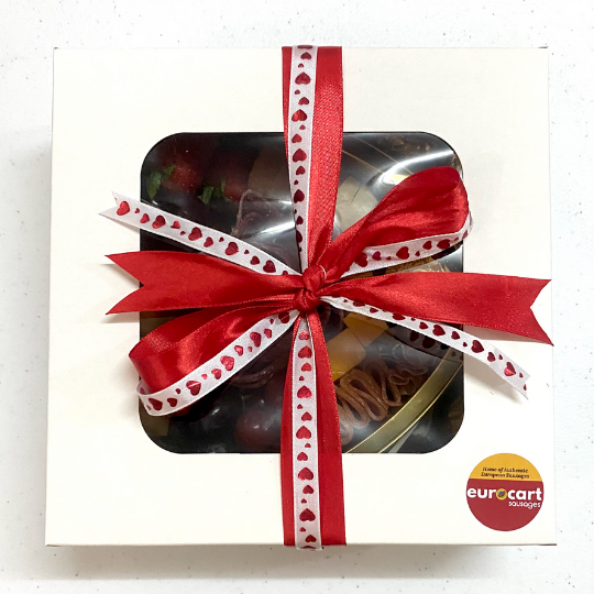 The Venice Platter is a ready-to-eat meat platter served in a heart-shaped tray and securely packed in a 9 x 9-inch white hard gift box with colored ribbons.