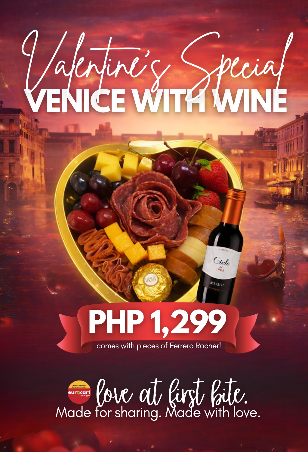 The Venice Box (with Wine) ready-to-eat meat platter is served in a heart-shaped tray with a piccolo-size wine and securely packed in a 9 x 9-inch white hard gift box with colored ribbons.